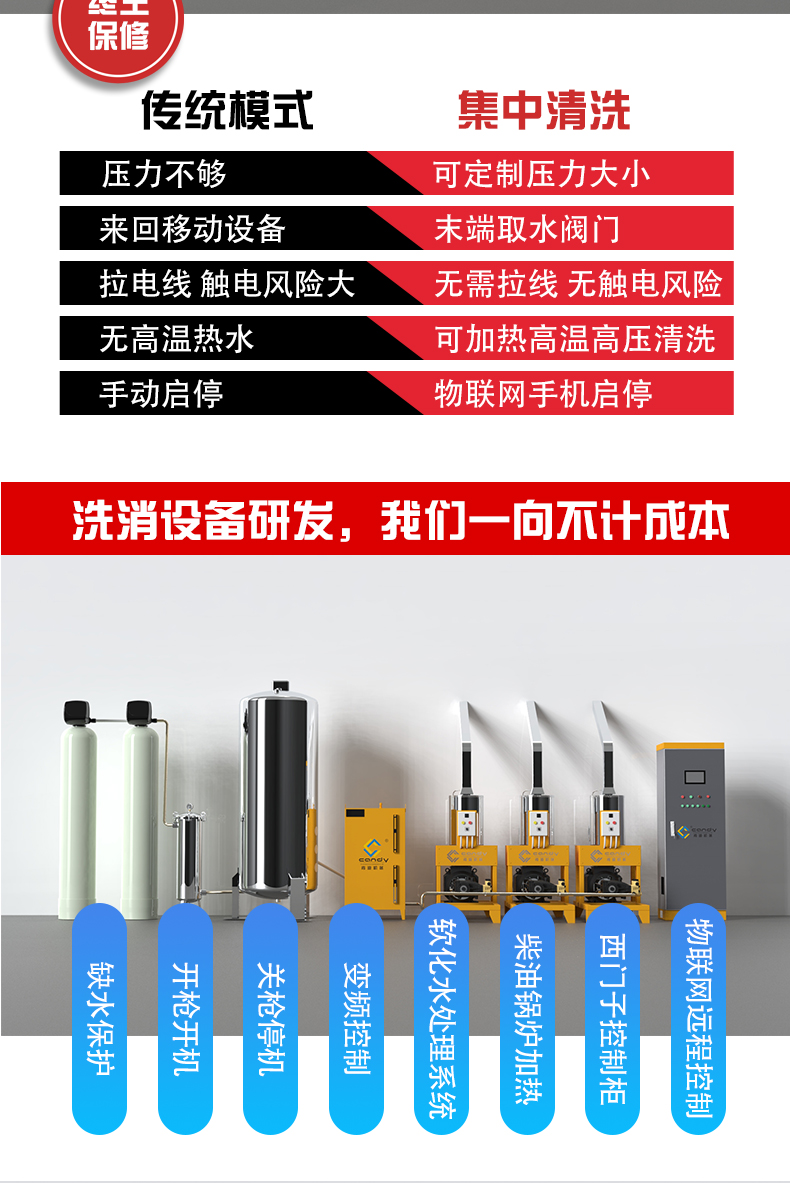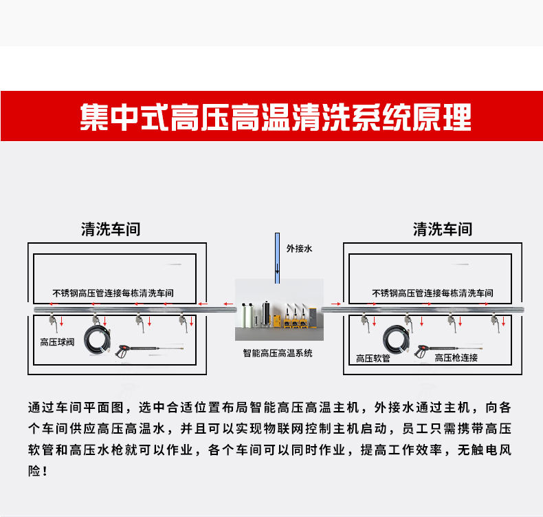 通過場所平面圖,選中合適位置布局智能高壓高溫主機,外接水通過主機,向各個場所供應(yīng)高壓高溫水,并且可以實現(xiàn)物聯(lián)網(wǎng)控制主機啟動,員工只需攜帶高壓軟管和高壓水槍就可以作業(yè),各個場所可以同時作業(yè),提高工作效率,無觸電風險!
